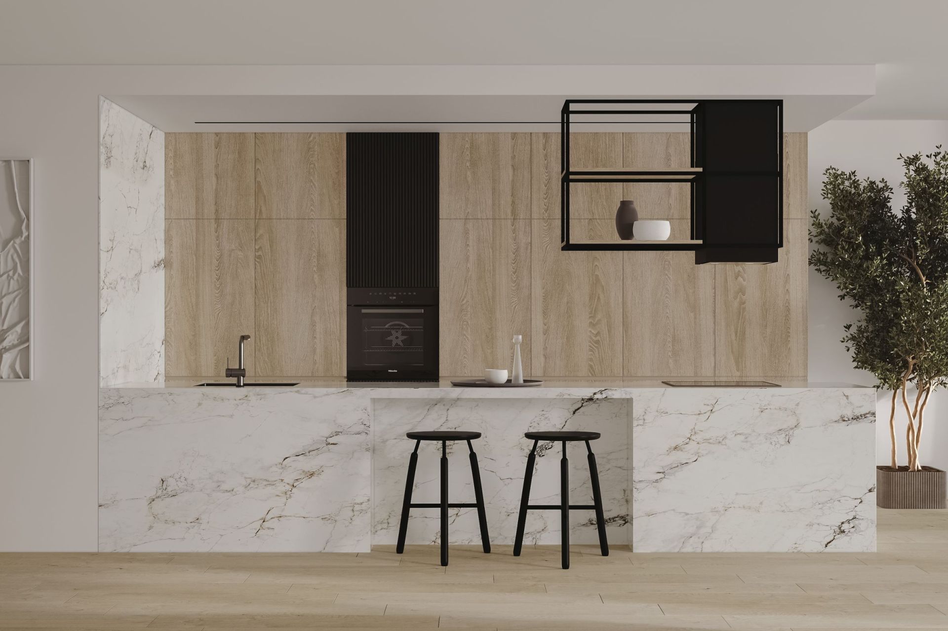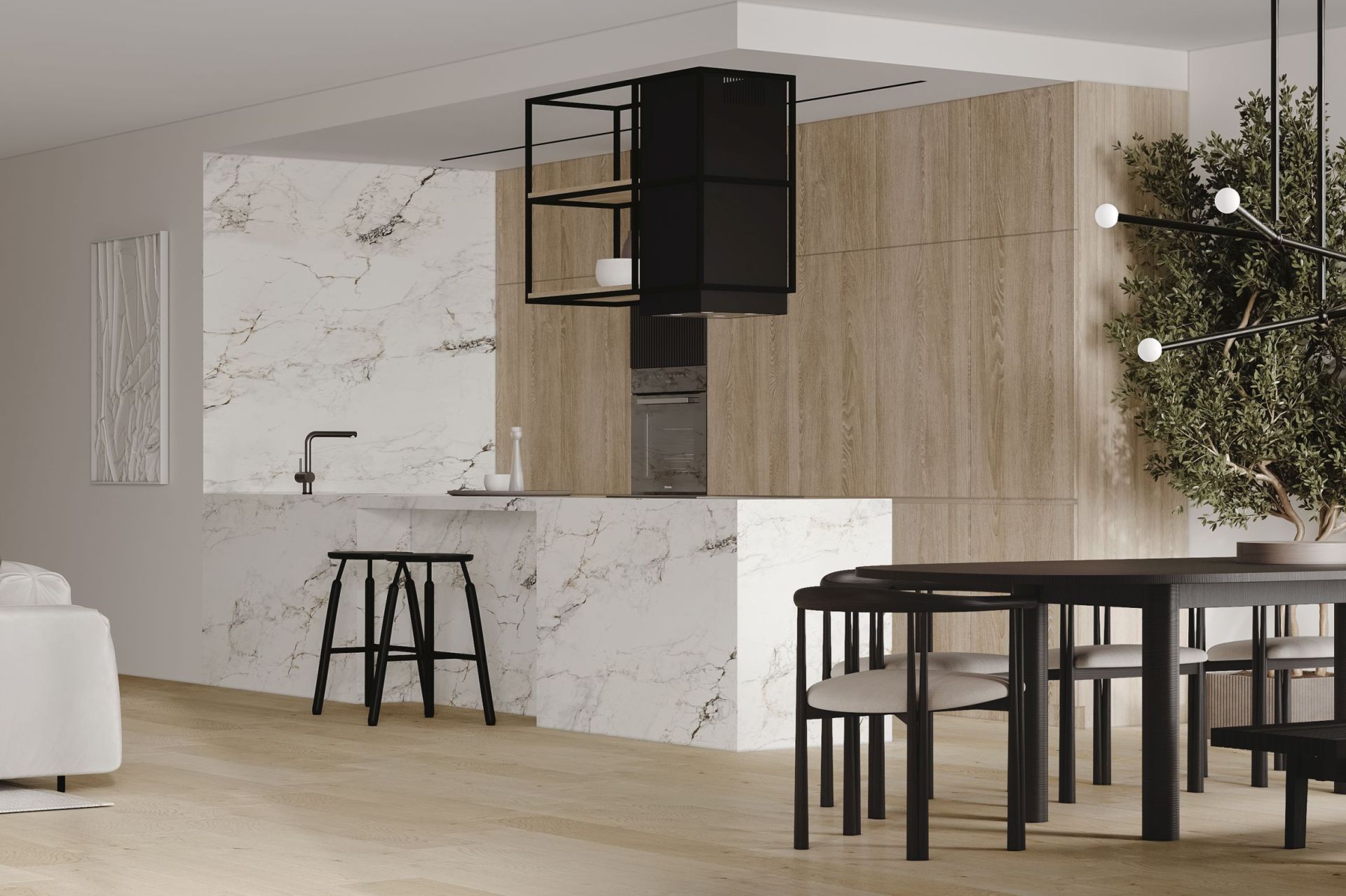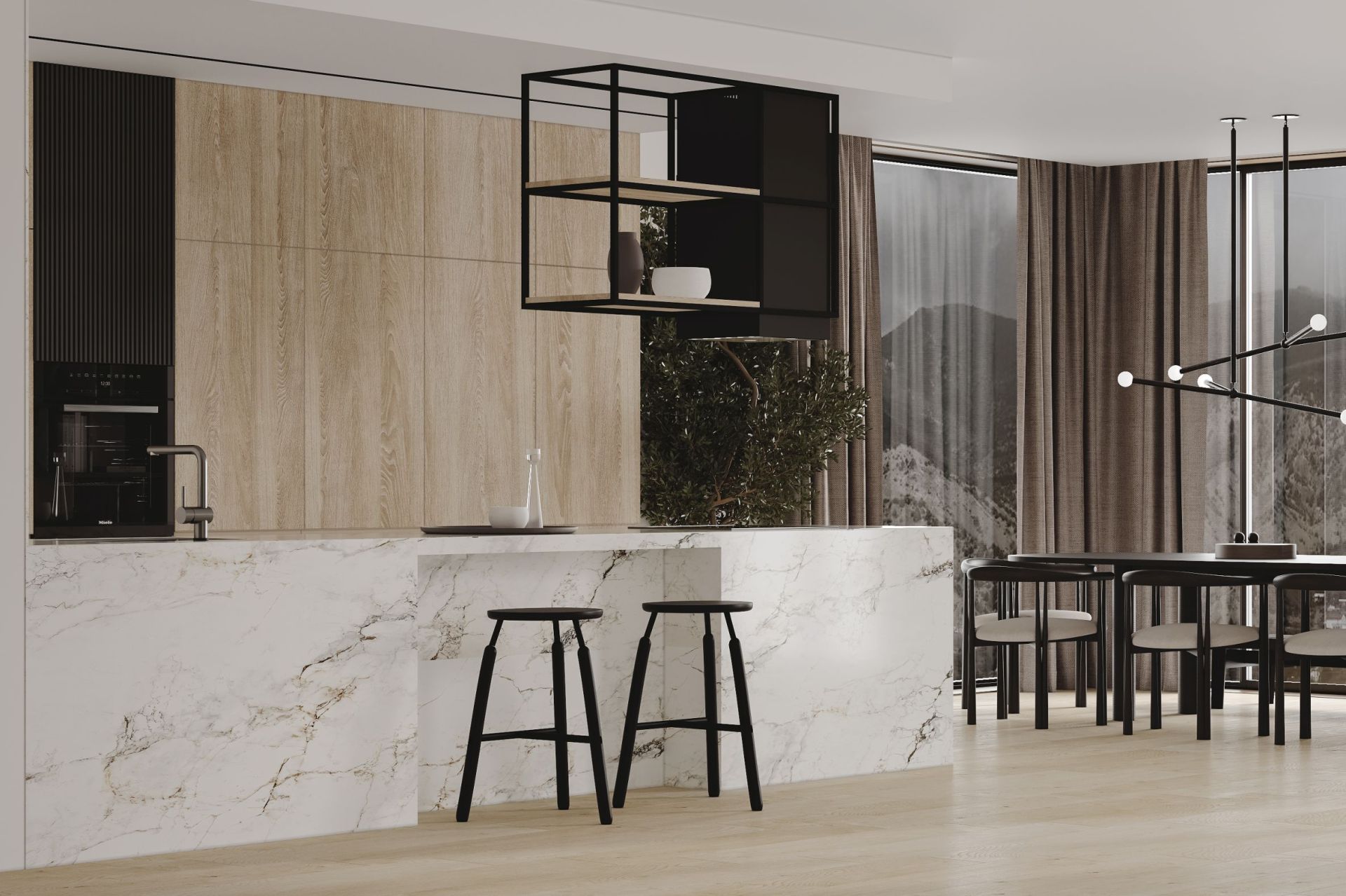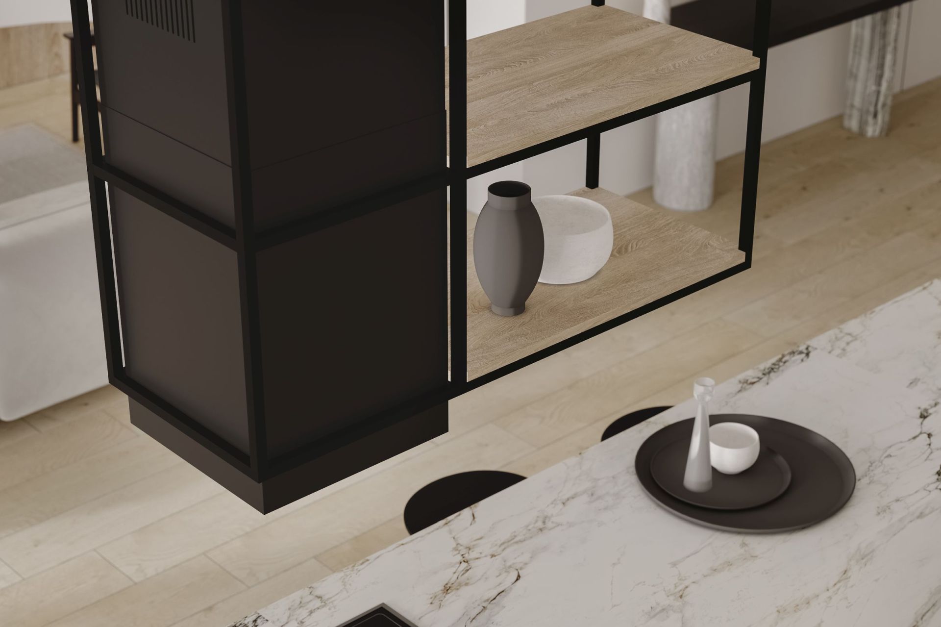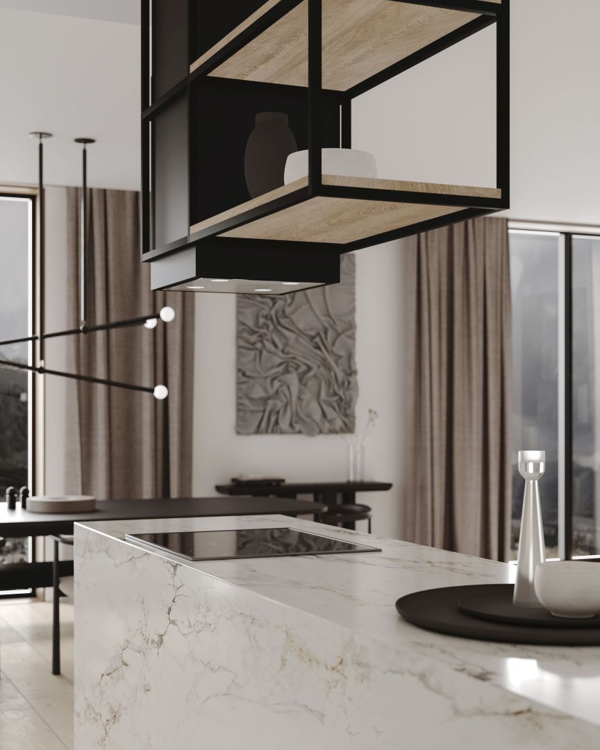 NORTBERG Quadro Cage Asymmetric Wood - нове бачення острівної витяжки у сучасній кухні. Її унікальний зовнішній вигляд гармонійно поєднуються з іншими кухонними приладами, що робить модель Quadro Cage новим трендом в дизайні Ващої кухні.