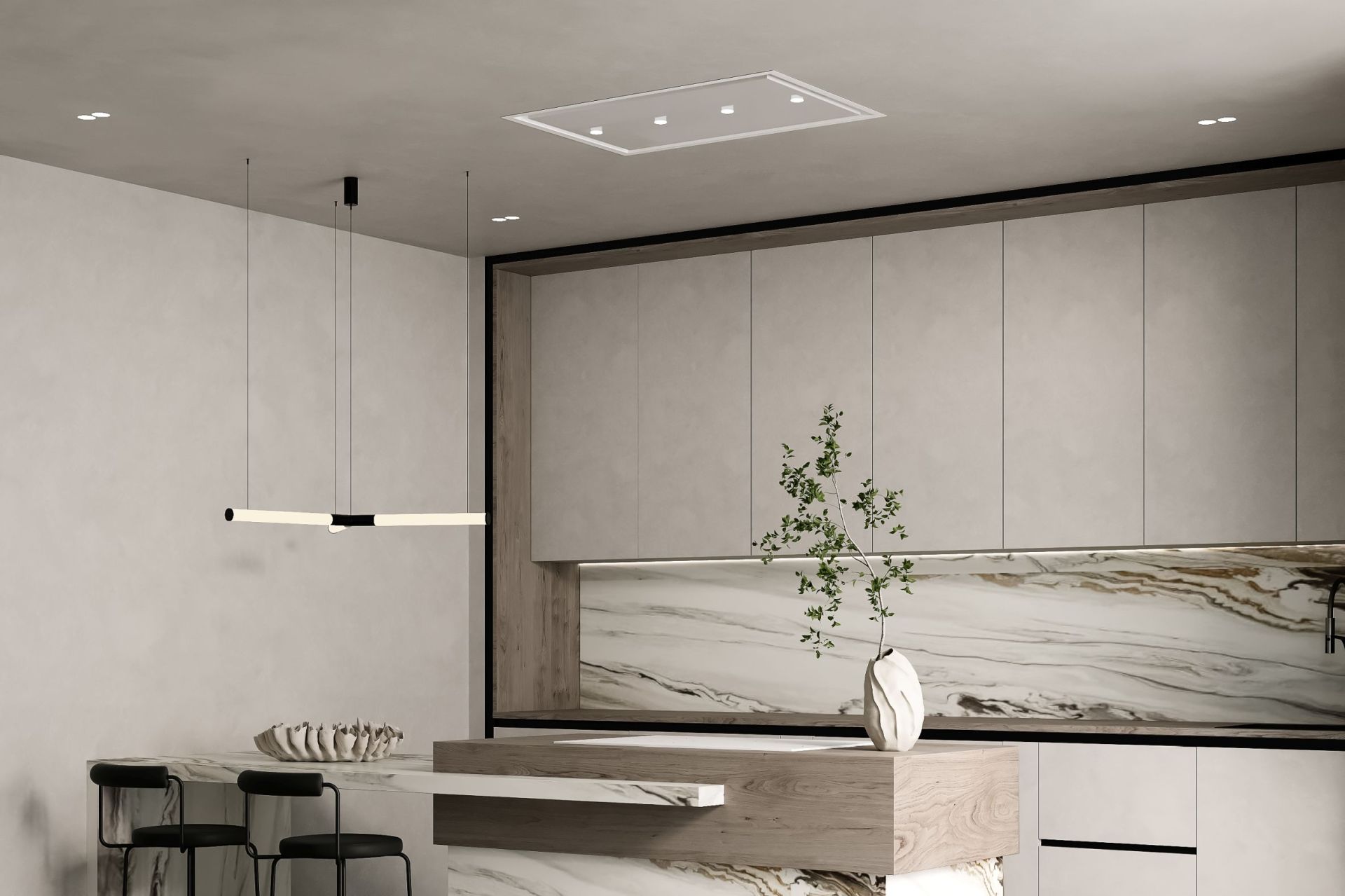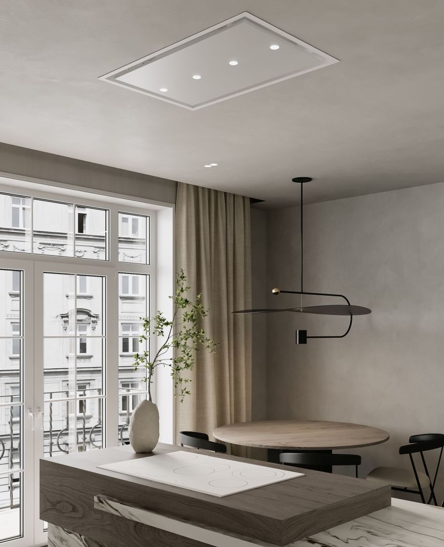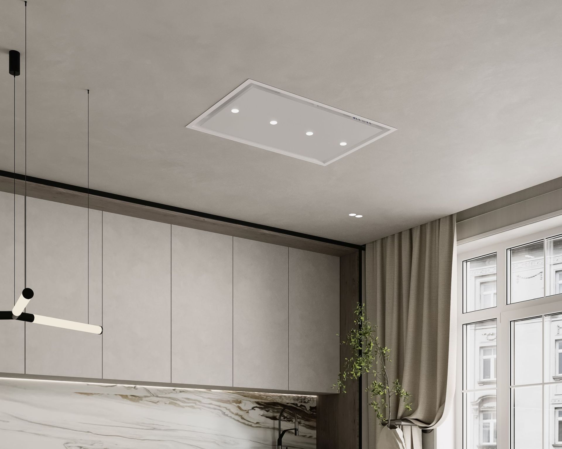 PLANET SUPER SLIM оригінальна стельова витяжка, в якій стильно виділяється елегантна скляна панель з підсвіткою у формі шістьох точок. Витяжка має світлодіодне освітлення та пульт дистанційного керування. Середню панель можна відкрити для легкого чищення та обслуговування.
